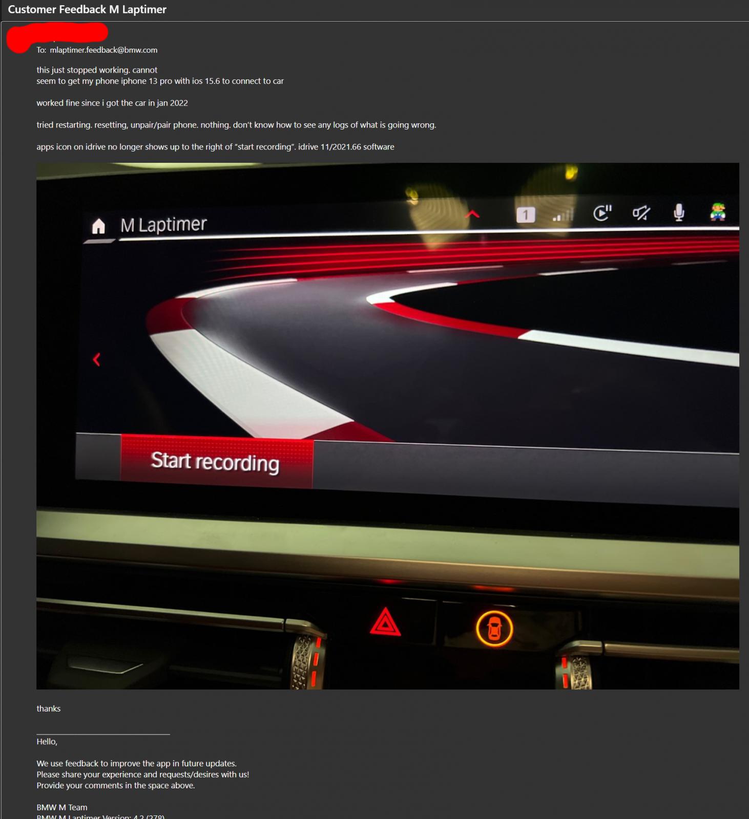 i replied back to mlaptimer.feedback@bmw.com and cc'd customerrelations@bmwusa.com asking them to restore the previously functionality, lol. even if they aren't going to update it, but yea, real bummer and on principal i want my $900 back since the only reason i got this package was for this. lap info in the HUD. good, fast car telemetry data. now they have taken both away. ugh.